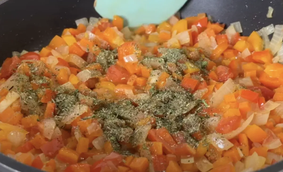 На сковороде разогрейте немного растительного масла. Сначала обжарьте лук до прозрачности, затем добавьте морковь, перец и помидор. Готовьте несколько минут, пока овощи станут мягкими и ароматными.