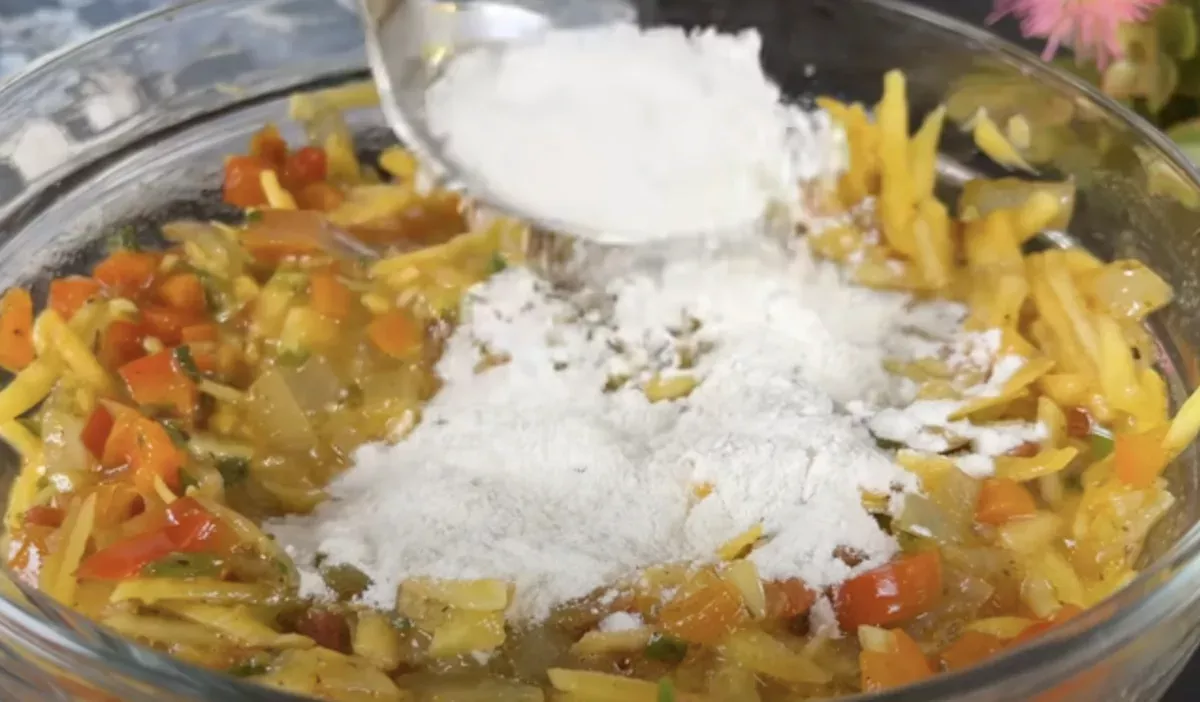 В большой миске соедините натертую тыкву с обжаренными овощами. Добавьте соль, паприку, итальянские травы и 2 столовые ложки муки.