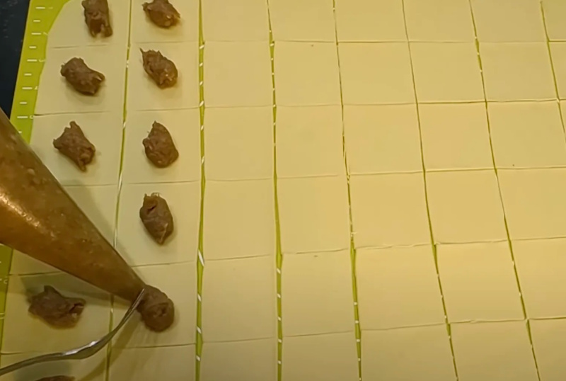 Фарш перекладываем в кулинарный пакет и выдавливаем небольшое количество в центр каждого квадратика (можно дозировать вилкой). Количество теста и начинки примерно одинаково, но фарша чуть больше.