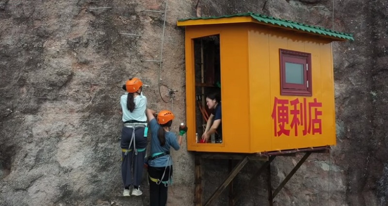 Щоб торгова точка була затребувана, вона повинна мати зручне розташування, пропонувати широкий асортимент товарів і гідний рівень обслуговування. Або бути єдиним в районі, щоб у покупців просто не було варіантів. Тому магазин у національному геологічному парку Сіньюжай у китайській провінції Хунань успішно працює. Він розташований на прямовисній скелі на висоті 120 метрів, а його клієнтами є скелелази.