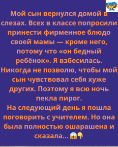 Моєму 10-річному синові сказали, що він «бідна дитина», і його не попросили принести мамину фірмову страву на «день народження вчителя». Він прийшов додому в сльозах. Я всю ніч пекла пиріг і пішла до школи розбиратися. Вчителька здивувалася: «Дня народження немає! Ваш син на вулиці з друзями і дуже щасливий».