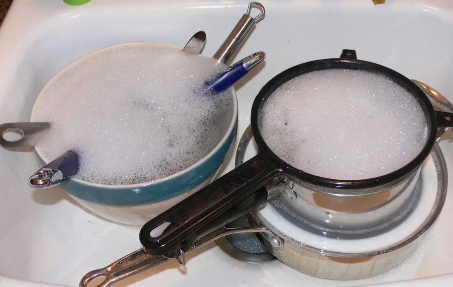 Она затыкает раковину, наливает горячую воду, добавляет моющее средство. Замачивает там всю грязную посуду. Протирает губкой. И… ставит сушиться.