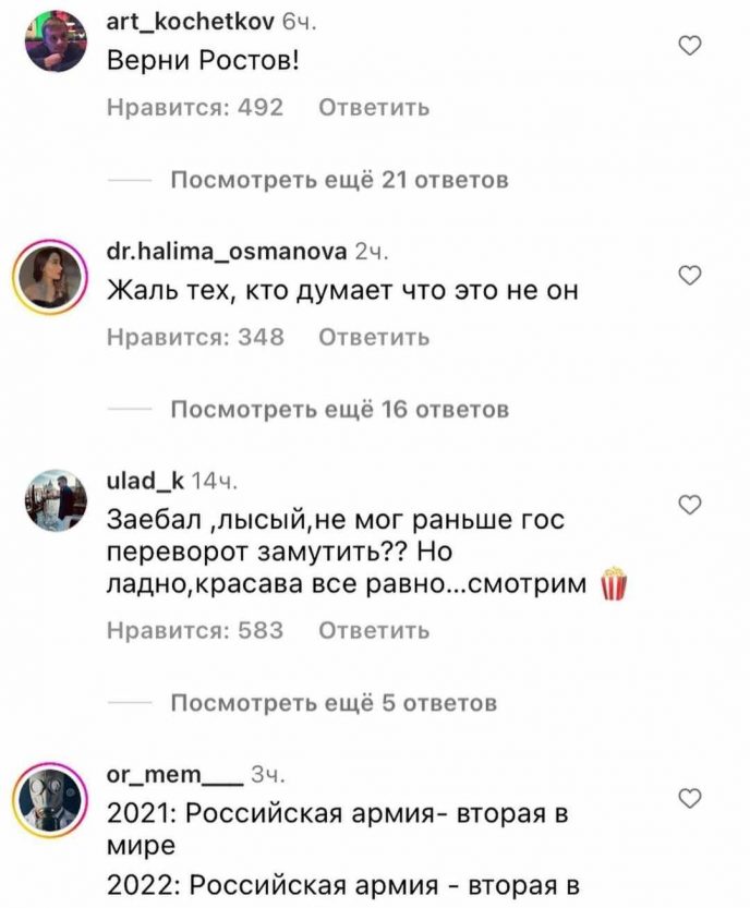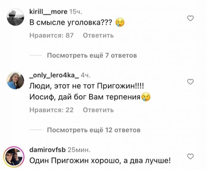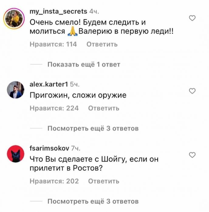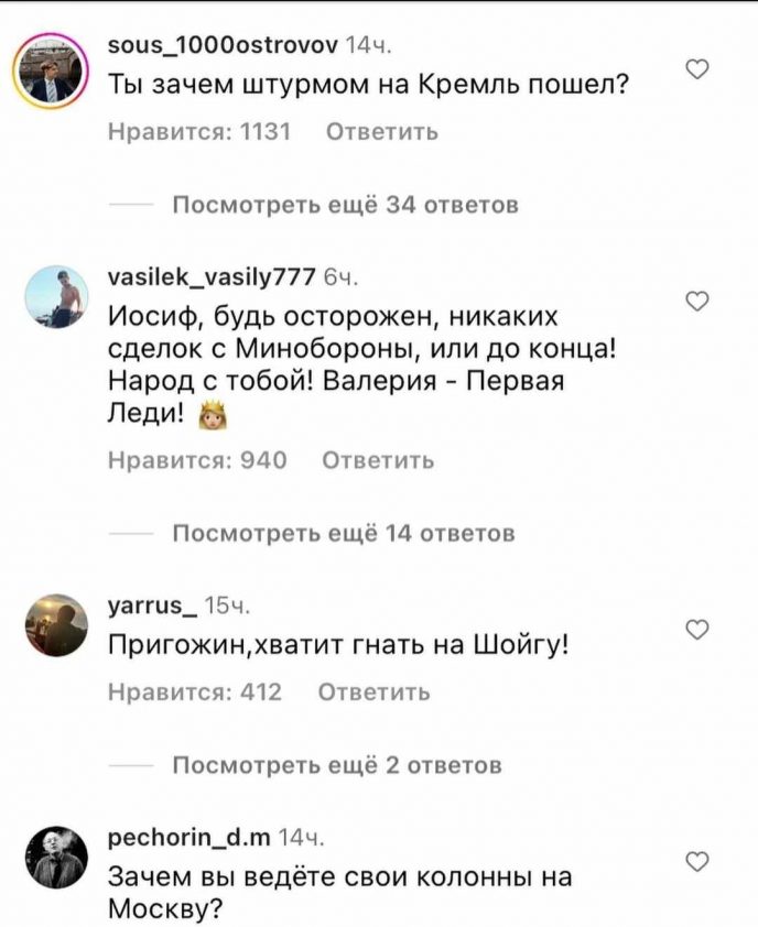 “Верни Ростов”, “Что там на счет Шойгу?”, “Хотим увидеть Валерию в роли первой леди”, “Так держать, Иосиф”, “Вы же назывались другом нашего главы. Как посмели?”,- пишут Пригожину в комментариях.