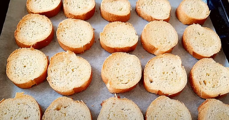 Нарізаю хліб, кладу на деко застелене пергаментом, зверху кладу шматочки масла. Відправляю у духовку при 170 градусів на 10-15 хвилин.
