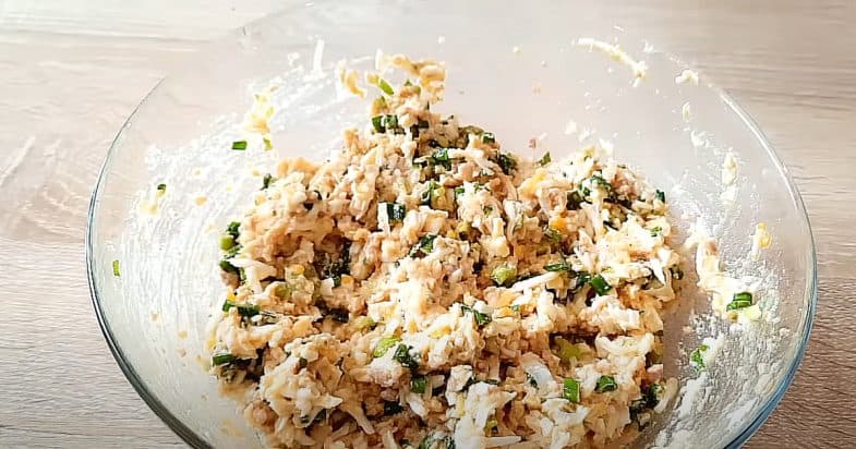 Печінку подрібнюю виделкою, натираю на терці варені яйця, нарізаю дрібно зелену цибулю, заправляю сіллю, перемішую.