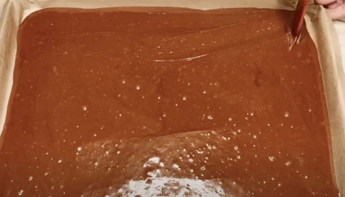 Викладаємо у форму 30×40 см, застелену пергаментом, розрівнюємо і ставимо в духовку, розігріту до 180°C.