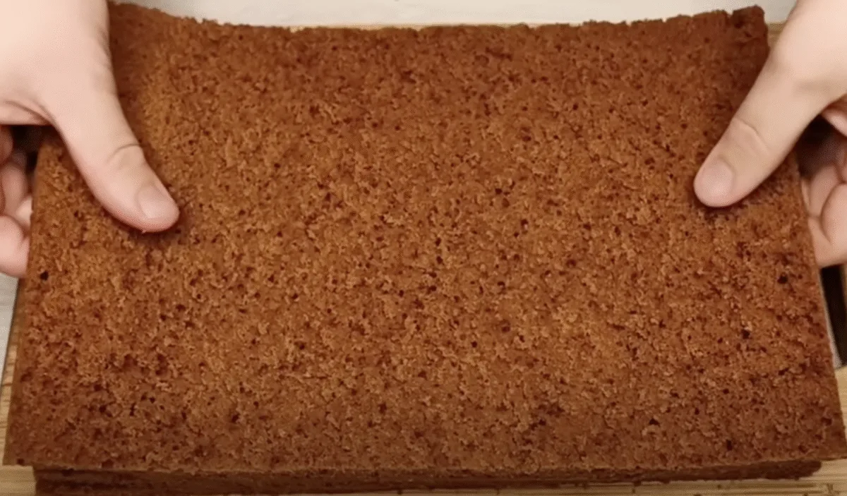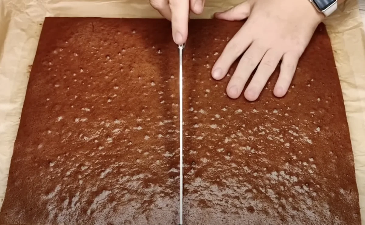 Готовий корж дістаємо, обрізаємо краї, а потім розрізаємо на 2 половини, а потім їх ще на 2 тонкі коржі. Отримуємо 4 коржі.