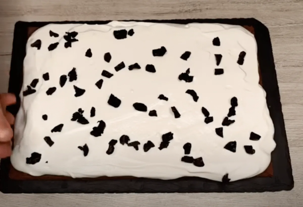 Перший корж змащуємо кремом, посипаємо чорносливом. Накриваємо другим коржем і повторюємо — крем, чорнослив, знову корж. Верх і боки торта щедро покриваємо кремом.
