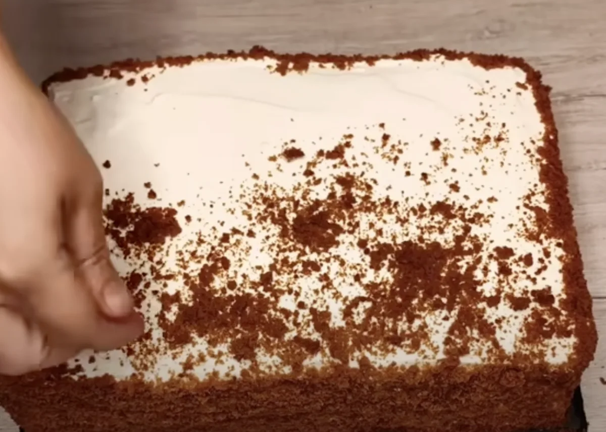Обрізки коржів подрібнюємо в крихту та обсипаємо ними торт — спочатку боки, потім верх.