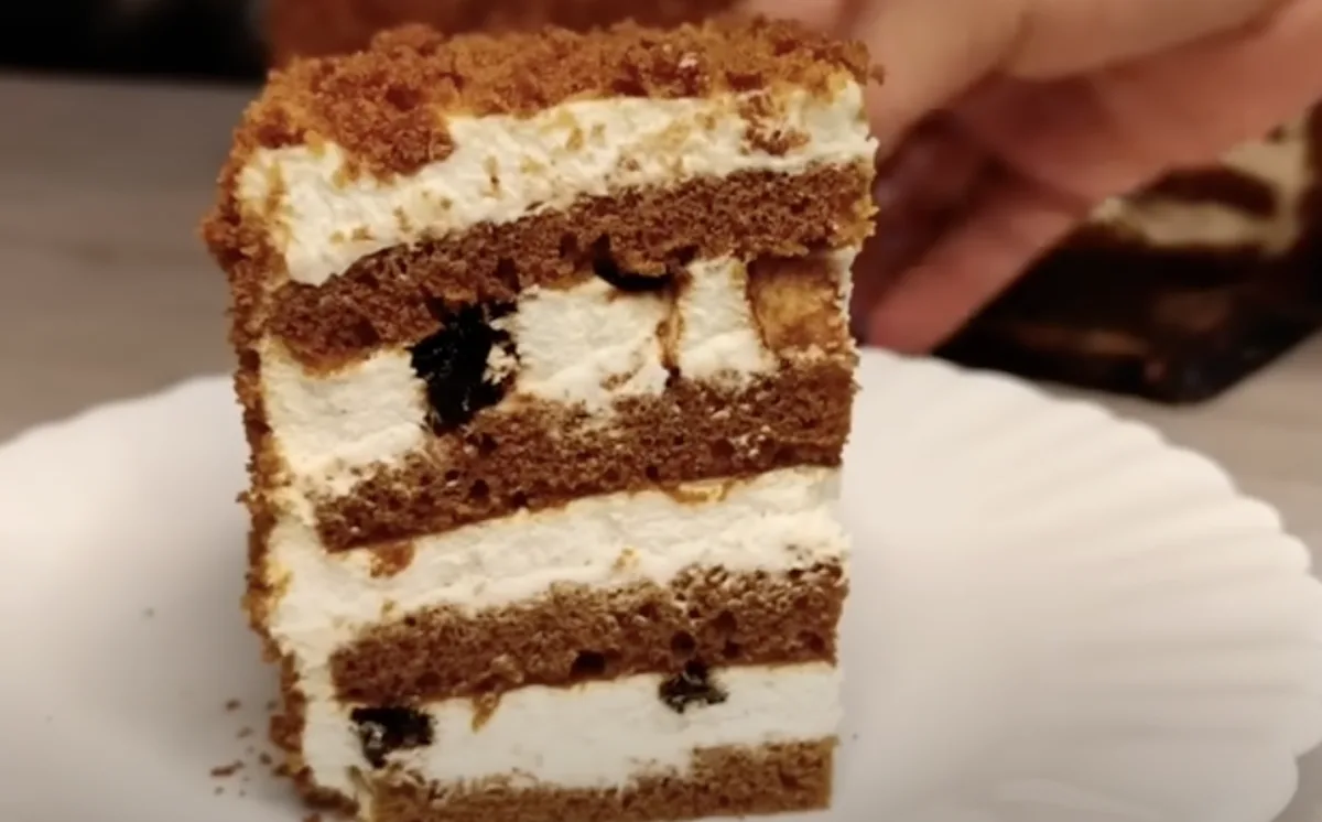 «Лінивий» медовик виходить надзвичайно ніжним, ароматним і збалансованим за смаком. Крем — легкий, повітряний, із приємною вершково-сметанною ноткою, а чорнослив додає особливої гармонії.