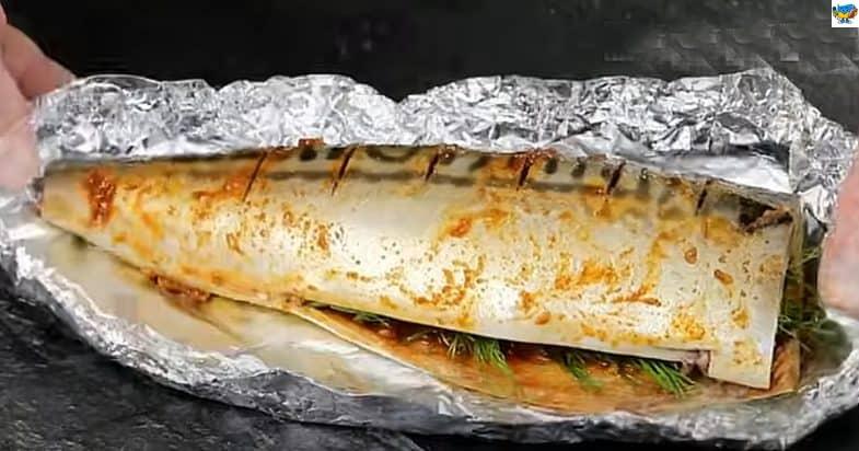 Очищаю рибу і промиваю в холодній воді, просушую її на паперових рушничках. Тепер роблю надрізи на спинці. У мисці змішую олію з лимонним соком, сіллю, паприкою і видавленим через прес часником, перемішую. Обмащую цим маринадом рибу зверху і всередині. Запихаю кріп всередину рибки. Кладу рибу у фольгу, підвертаючи усі краї.
