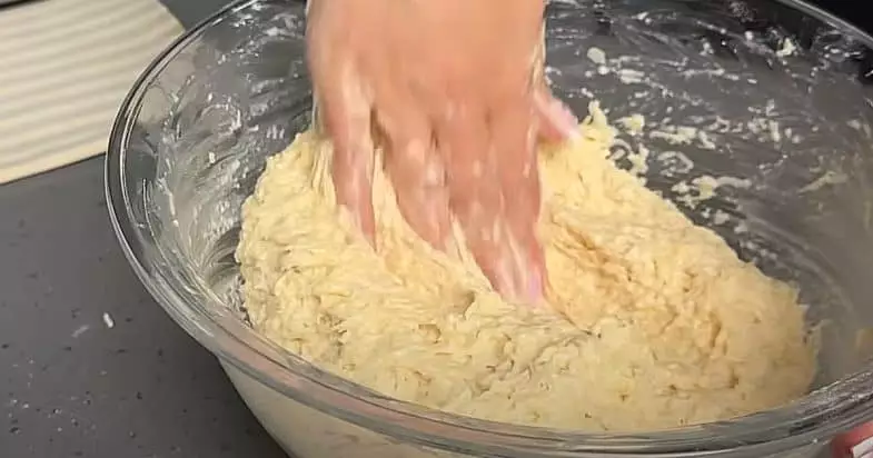 Картоплю натираю на дрібній тертці, промиваю холодною водою двічі. Віджимаю руками, але не досуха, хай трішки соку залишиться. Перекладаю в глибоку миску, додаю сіль, борошно й перемішую. Додаю молоко з дріжджами, замішую тісто руками. Воно виходить ніжне, в’язке. Миску накриваю харчовою плівкою, залишаю в теплому місці на 1,5 години.