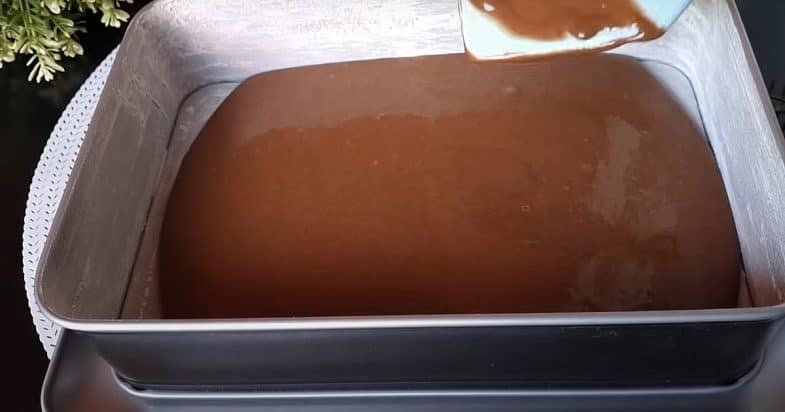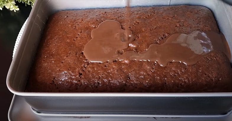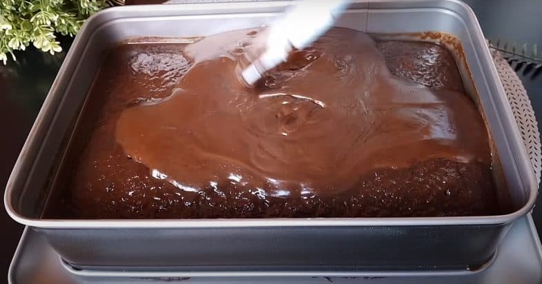 У каструлі змішую цукор, розчинну каву, какао, молоко. Кладу шоколад і масло, розтоплюю на вогні, помішуючи. Готовий корж протикаю виделкою. Половиною маси поливаю пиріг, іншу половину залишаю.