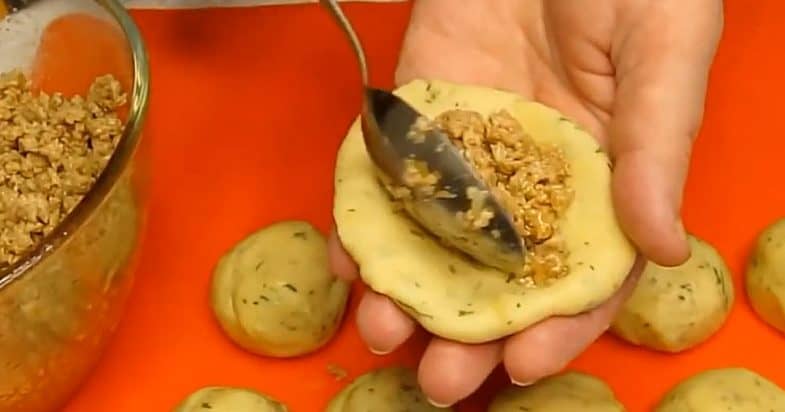 Картоплю відварюю у каструлі і підсоленій воді до готовності. Потім зливаю воду і перетворюю її у пюре, додати перцю і солі. Розбиваю яйця і додаю нарізаний кріп, перемішую. Всипаю частинами борошно, вимішую тісто. Тісто повинне злегка липнути до рук.