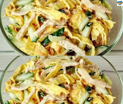 Нарізаю тонкими брусками свіжий огірок. Викладаю огірки та яєчну соломку у салатник. Відварену курячу грудку ділю на волокна. Нарізаю півкільцями цибулю, обсмажую в олії на сковороді до золотистості. Додаю цибулю, заправляю салат майонезом і перемішую.